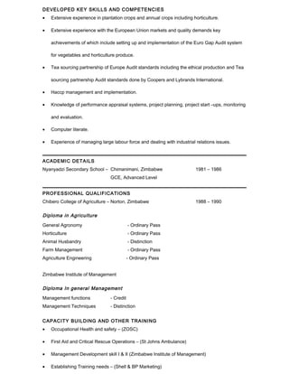 Gift Happymore Chibvuri has over 25 years of experience in agriculture, including managing plantations and farms. He has extensive experience with crops like tea, coffee, maize, soybeans, potatoes and horticulture. He is skilled in quality standards like Euro Gap and HACCP. Chibvuri holds a diploma in agriculture and general management. He is currently managing a farm growing maize, beans, potatoes and vegetables with livestock. References are provided from past employers in Zimbabwe and Mozambique.