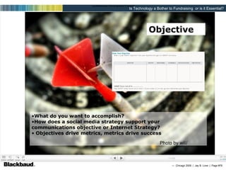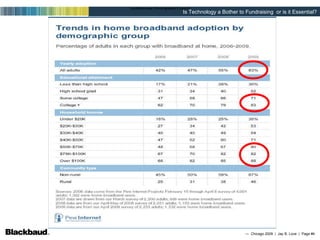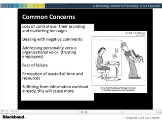 The document discusses the importance of technology, especially email and websites, for nonprofit fundraising and engagement. It provides tips on growing email lists, segmenting lists, email design, landing pages, and using social media and video to engage supporters online. The key message is that nonprofits should use an integrated online and offline strategy to build relationships and raise funds.
