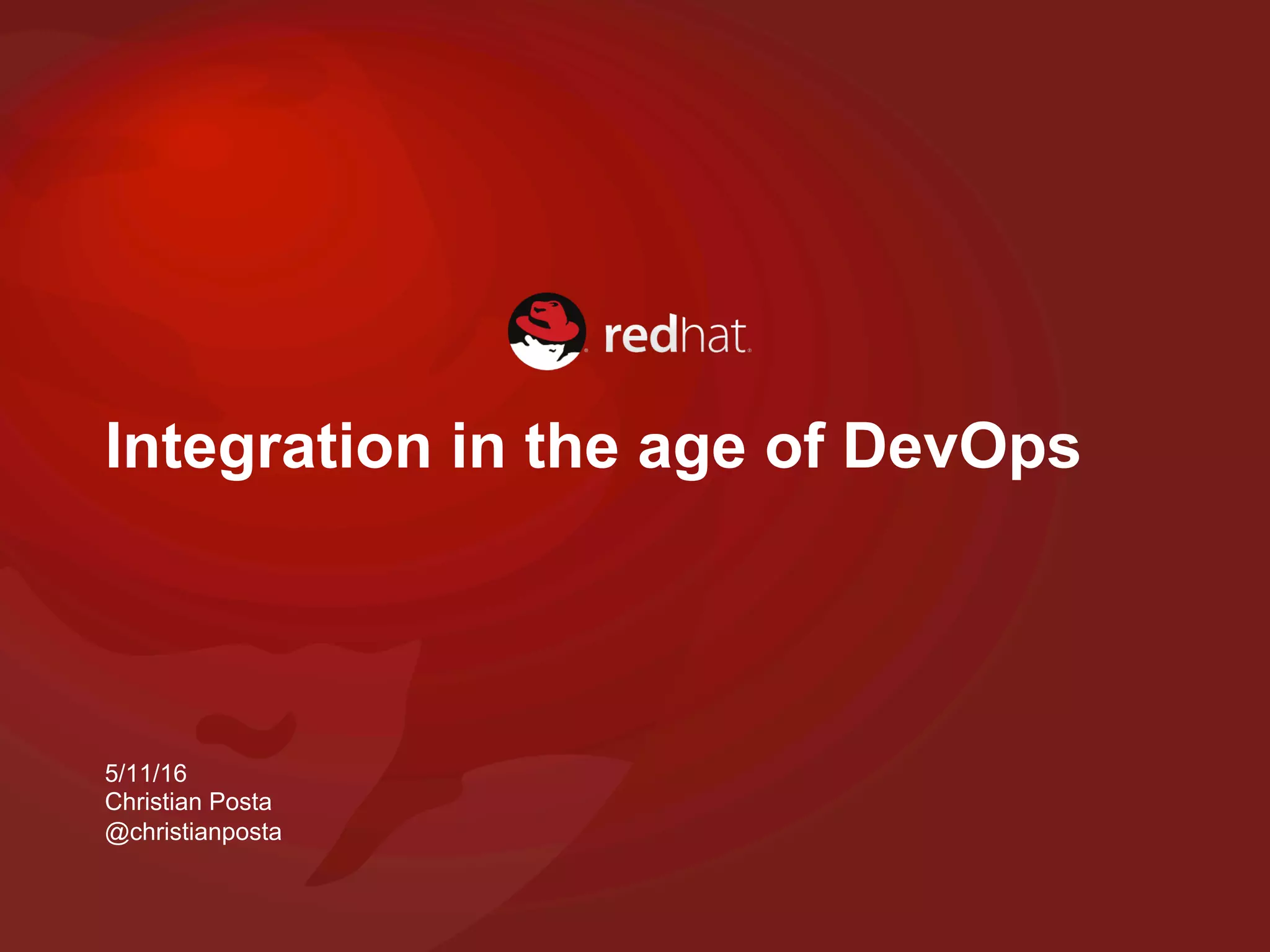 This document discusses integration in the age of DevOps. It describes how microservices help solve the problem of decoupling services and teams to move quickly at scale. Apache Camel is presented as a solution for integration that allows for reliable and distributed integration through mechanisms like messaging. Kubernetes and Docker are discussed as platforms that help develop and run microservices locally and at scale by providing automation, configuration, isolation and service discovery capabilities.