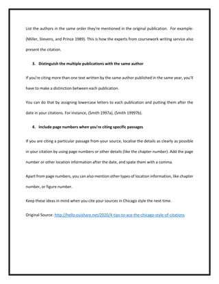 This document provides four tips for effectively using Chicago style citations in academic papers. Key points include proper formatting for author names, distinguishing multiple works by the same author, and including specific page numbers when citing particular passages. The guidance aims to simplify the Chicago style citation process to avoid common mistakes.