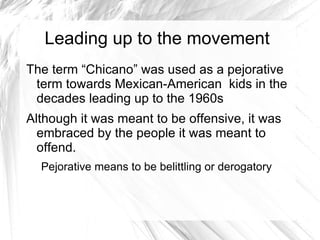 The Chicano Movement emerged in the 1960s in response to discrimination faced by Mexican Americans. It had three main components: the Chicano youth movement fought for equal rights in education, the farmworkers movement advocated for better wages and working conditions, and MAYO organized Mexican American youth. The movement achieved greater civil rights protections but Mexican Americans still face issues around immigration and discrimination today.