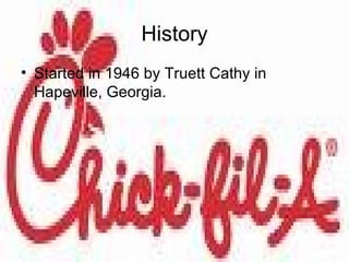 Chick-fil-A was started in 1946 by Truett Cathy in Georgia and sells popular chicken products like sandwiches and nuggets along with waffle fries and drinks. It has around 1380 franchises globally and becoming a franchise owner requires an initial $5,000 commitment along with taking out a loan to hire employees, buy supplies, and operate a location, with key competitors being KFC and Church's Chicken.