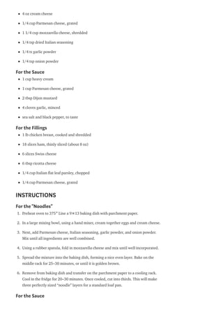 This recipe provides instructions for making a chicken cordon bleu lasagna that is keto-friendly. It uses ingredients like eggs, cream cheese, and mozzarella to create low-carb "noodle" layers as a substitute for traditional lasagna noodles. The lasagna is layered with a creamy Parmesan sauce, shredded chicken, ham, and Swiss cheese. It is baked until golden brown and each serving contains only 5.5 grams of net carbs while providing protein from the chicken, ham, and cheeses.