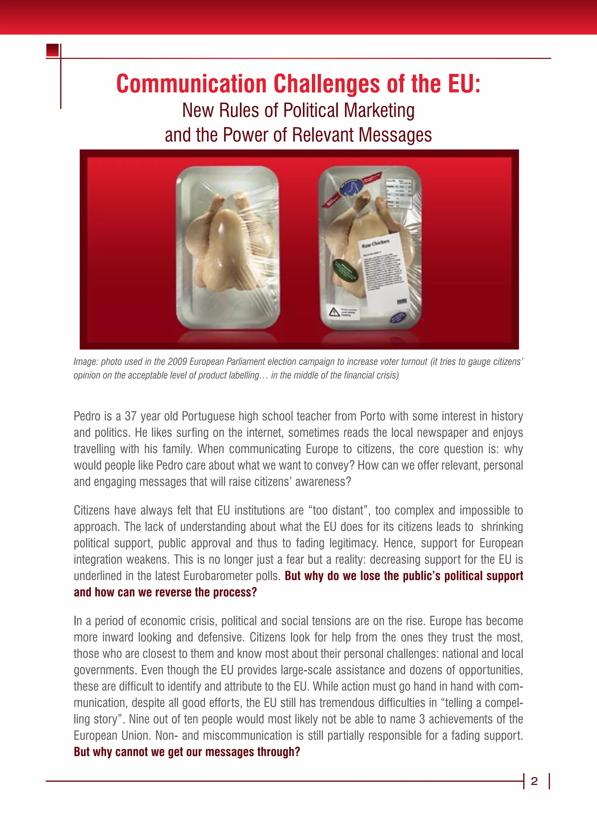 The document discusses the communication challenges faced by the EU, highlighting the disconnect between EU institutions and citizens due to complex messages and a lack of personal relevance. It emphasizes the need for targeted, engaging messaging that resonates with specific audiences, as well as the importance of improving the internal communication within the EU to enhance legitimacy and political support. Recommendations include redefining communication strategies, utilizing modern tools, and focusing on concrete, relatable stories to better inform and connect with the public.