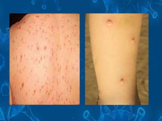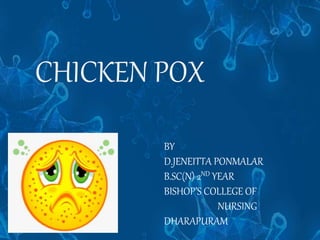 Chicken pox is caused by the varicella zoster virus. It mainly affects children under 10 years of age and is highly contagious. The rash appears 10-21 days after exposure and spreads in crops over 3-5 days. Complications can include bacterial infections if the blisters become infected. Treatment focuses on relieving symptoms and antiviral medication for at-risk groups. Nurses monitor for signs of infection and educate on hygiene to prevent spread. Vaccination provides effective prevention against chicken pox.