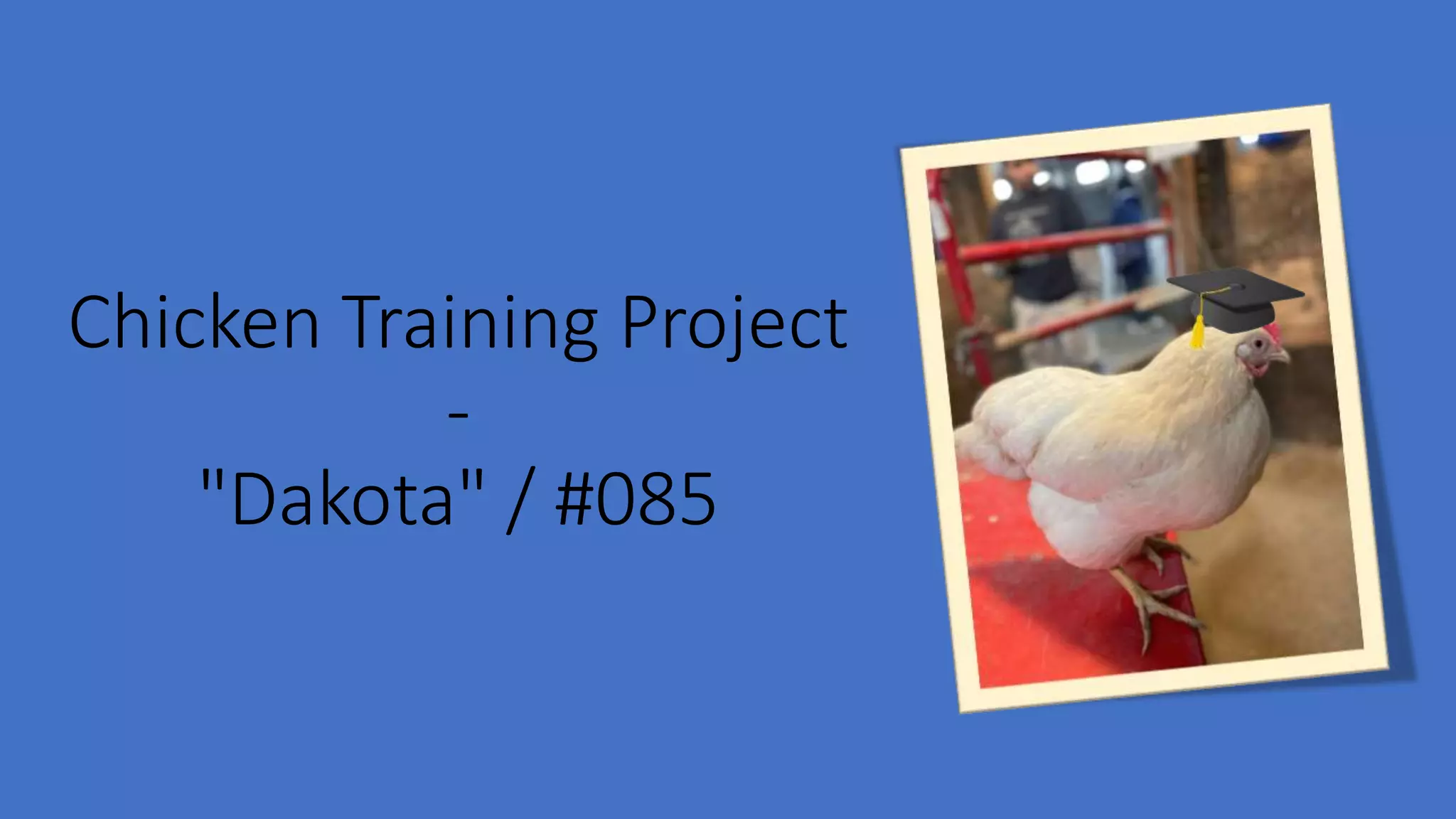 - The document summarizes a chicken training project where the goals were to teach chicken #085 'Dakota' to sit and spin on command. Over several weeks, the trainers used clicker training and luring with food to teach Dakota to sit by crouching down in response to the verbal cue. They also used luring to teach Dakota to spin in a circle by moving the food from under her chin to over her shoulder. After 10 training sessions, Dakota had learned to reliably sit and spin on command. The trainers reflected on lessons learned, such as using higher value treats and being consistent in training methods.