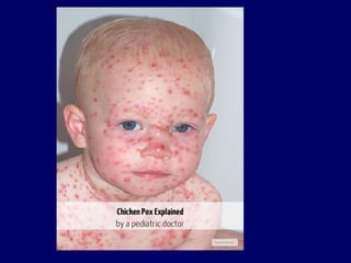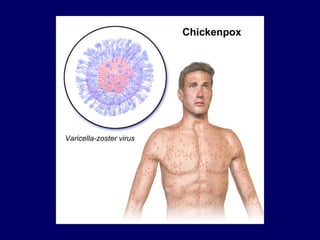 The document discusses human herpesviruses, focusing on varicella-zoster virus (VZV) that causes chickenpox and shingles. It outlines the virus's characteristics, transmission, clinical manifestations, complications, diagnosis, treatment, and prevention strategies, including vaccination and antiviral therapies. The document emphasizes the importance of immunization and the reduced incidence of chickenpox following the introduction of the vaccine.