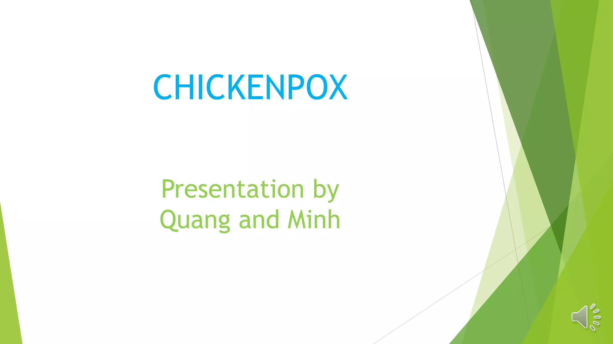 Chickenpox is a disease that causes a characteristic itchy skin rash with small blisters that eventually scab over. It begins with fever, runny nose, headaches and feeling unwell before a rash develops. The virus is spread through coughing early on or direct contact with blister fluid later. Prevention includes vaccination at 18 months and covering coughs/sneezes when sick. While it usually resolves on its own, antiviral drugs can treat severe cases.