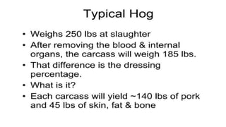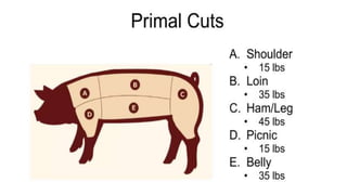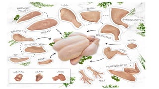 Poultry must be prepared according to approved specifications and standards. Quality refers to properties like proportion of meat and bone and freedom from defects. Grading involves evaluating poultry against standards to determine quality. Many factors are considered, including conformation, fleshing, fat covering, feathers, and cuts or breaks. Poultry can be cut into various parts like halves, quarters, breasts, wings, and boneless pieces according to standard procedures. Salt is an effective preservative that works by drawing water out of food to dry it and killing microbes through osmotic pressure.