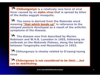 Chikungunya is a viral fever transmitted primarily by the Aedes aegypti mosquito, known for causing debilitating arthritic symptoms and high fever, with outbreaks occurring mainly in Africa, India, and Southeast Asia. The disease, not typically fatal but impairing, has seen significant epidemics in India, particularly since a resurgence around 2005. Prevention focuses on mosquito control and personal protective measures, as there is no specific treatment or vaccine available.