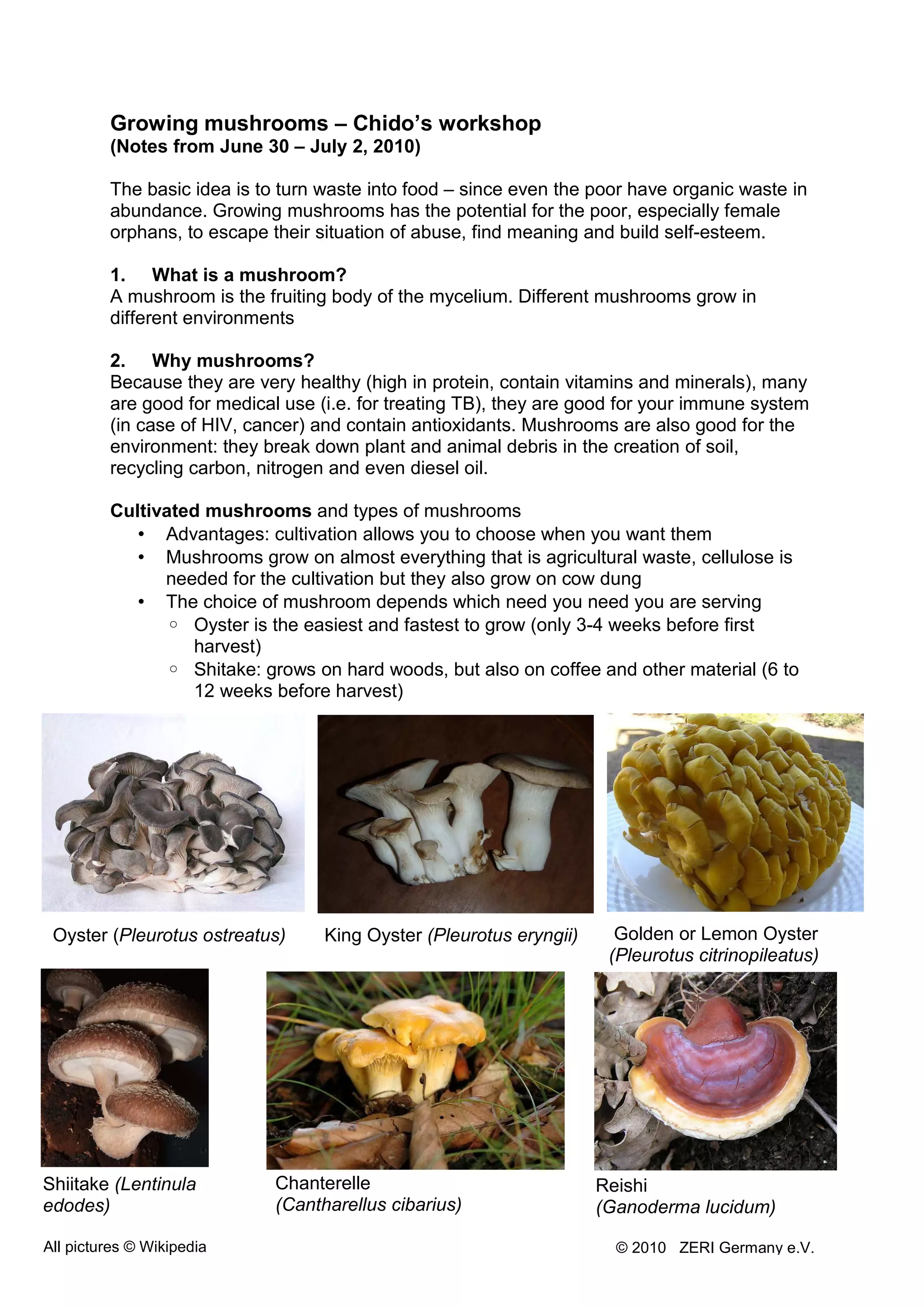 The document outlines a workshop on growing mushrooms, emphasizing the potential for improving the lives of the poor, particularly female orphans, by turning waste into food. It covers various aspects of mushroom cultivation, including seed production methods, ideal conditions for growth, and detailed procedural steps from substrate preparation to harvesting. Additionally, it highlights the nutritional benefits of mushrooms and their environmental impact, while also providing resources for further learning.