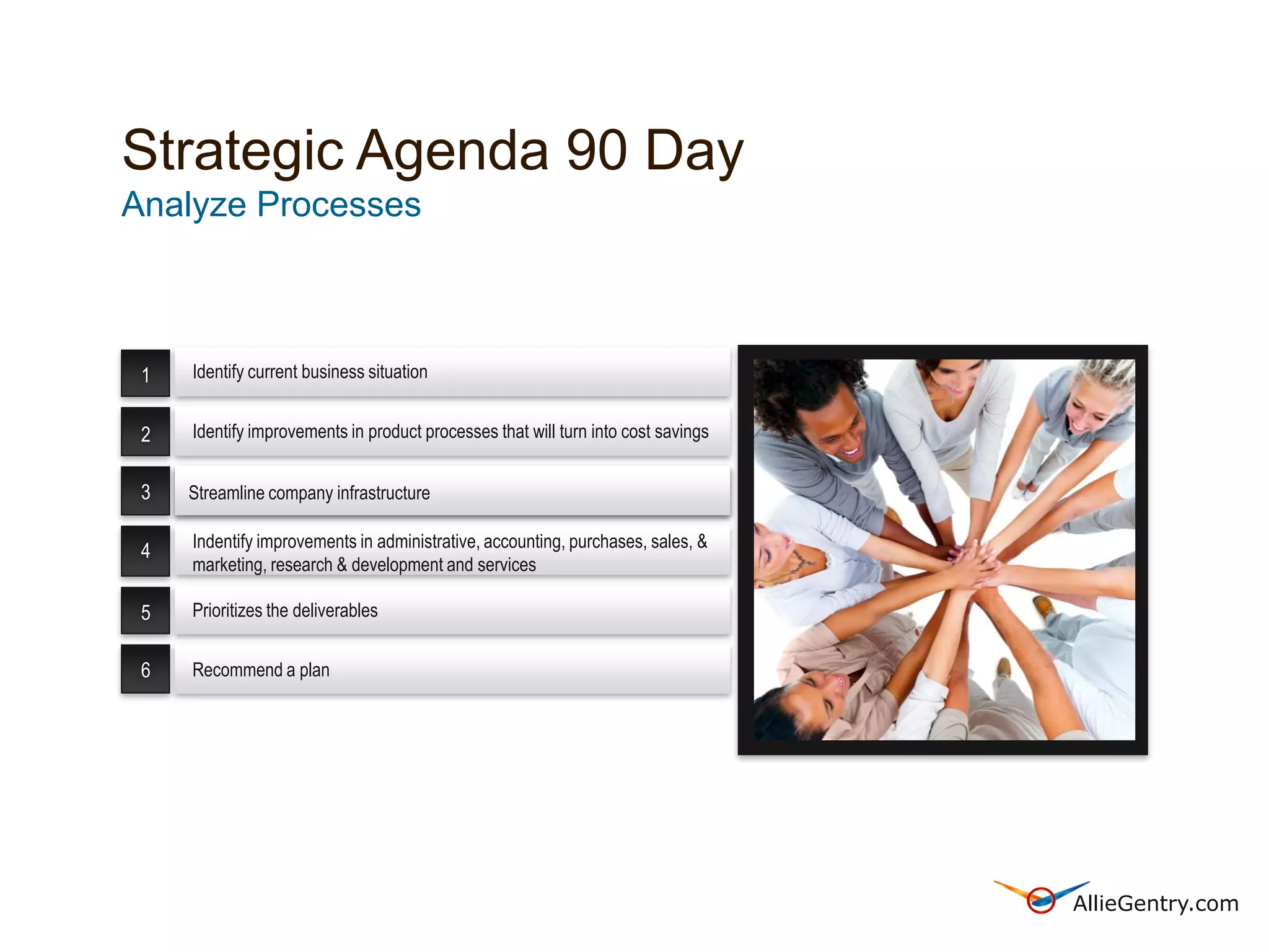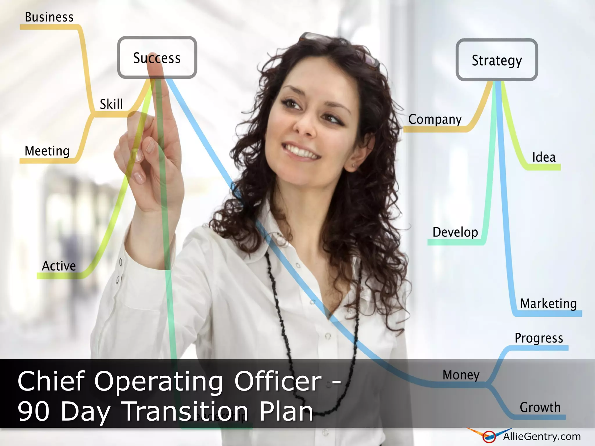 The document outlines a 90-day transition plan for a Chief Operating Officer at Alliegentry.com, focusing on analyzing current business processes, identifying improvements to enhance cost savings, and streamlining the company infrastructure. It includes specific goals such as creating a strategic agenda, assessing needs, and prioritizing deliverables across various functional areas including HR, accounting, sales, and marketing. The overarching objective is to expand the company's reach into new vertical markets while improving customer satisfaction and increasing revenue.