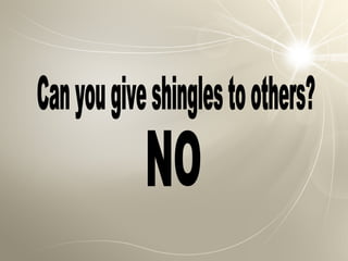 The document discusses shingles (herpes zoster), which is a painful skin rash caused by reactivation of the varicella zoster virus, including symptoms, diagnosis, treatment with antivirals, complications like postherpetic neuralgia, prevention with the Zostavax vaccine for those over 60, and special considerations for shingles affecting the eye or ear.