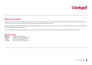 The document discusses various global experiential marketing campaigns from 2012-2013. It provides examples of innovative experiential campaigns for brands like Crabbie's Alcoholic Ginger Beer, Bulla Creamy Classics ice cream, Evian water, Radox shower gel, Electrolux appliances, McDonald's Happy Meals, and LEGO Star Wars toys. The campaigns engaged consumers through interactive experiences at shopping centers, social media competitions, cooking experiences, and a musical LEGO installation.