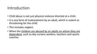 This document discusses child abuse, including definitions, types, causes, effects, and preventive measures. It defines child abuse as any form of maltreatment that threatens or harms a child, including physical, emotional, and sexual abuse as well as neglect. Common causes are cited as stress, mental illness, substance abuse, and domestic violence. Effects on children include long-term psychological and relationship problems. Preventive measures include education, therapy, building support systems, and teaching children about boundaries and safety.