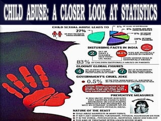 The document discusses child abuse, defining it as any act or failure to act by a parent or caregiver that harms a child. The major types of child abuse are sexual abuse, emotional/psychological abuse, neglect, and physical abuse. Child abuse is a global issue and India has high rates of crimes against children. Efforts are needed to increase awareness, prioritize child protection, and support child abuse victims.