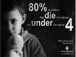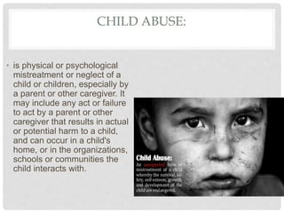 Child abuse can include physical, psychological, or neglect of a child by a caregiver. It may result in harm to a child's health or development. Physical abuse involves physical violence, while neglect is the failure to provide basic needs. Verbal abuse damages a child emotionally through belittling, shaming, threats, or rejection. Abused children often experience insecurity, low self-esteem, relationship issues, and mental health problems into adulthood. They are also more likely to engage in criminal behavior or have health problems later in life. While abuse inflicts long-term harm, some children are resilient and able to live well despite difficult childhood experiences.