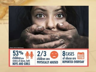 The document provides an extensive overview of child abuse, defining it as acts of physical, emotional, or sexual abuse towards minors, often perpetrated by caregivers. It discusses various factors contributing to child abuse, its long-term effects, and different forms including neglect, emotional abuse, and sexual abuse, supported by sobering statistics on prevalence. Additionally, it outlines governmental measures such as the Protection of Children from Sexual Offences (POCSO) Act aimed at preventing and addressing these abuses.