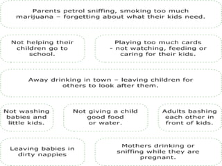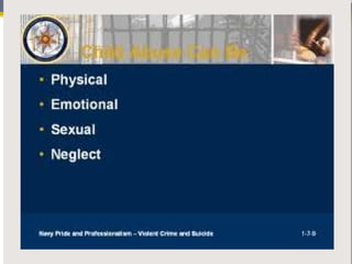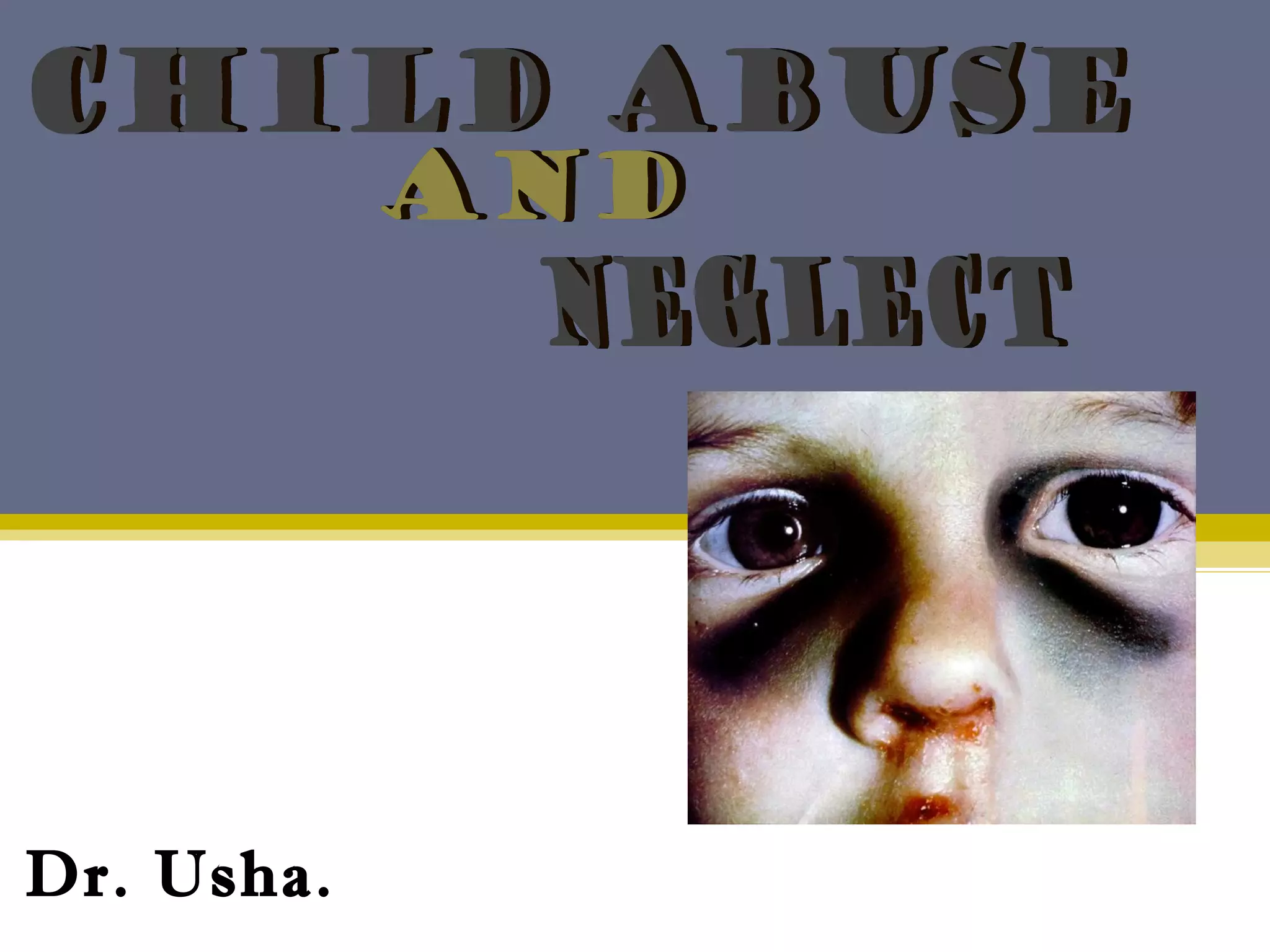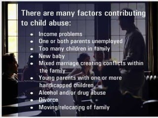 The document provides an overview of child abuse, defining it as non-accidental physical injury inflicted by caretakers and detailing various types including emotional and physical neglect. It highlights the prevalence of child abuse across different demographics, particularly in single-parent households and remote areas, and discusses the long-term effects on victims, including psychiatric problems and health issues. Furthermore, it emphasizes the importance of proper documentation, examination, and reporting by healthcare professionals, along with relevant laws in India and the role of various organizations in addressing these issues.