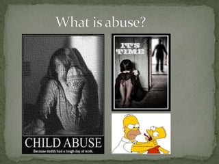 This document discusses different types of child abuse including physical, sexual, emotional/verbal abuse, and neglect. It defines each type of abuse and provides examples. The document also discusses the causes of abuse, the consequences abuse has on children, and ways to help prevent child abuse such as looking for signs of abuse and reporting any suspicions. It promotes calling 15999Childline, a helpline number in Malaysia for children who need help or are experiencing abuse.