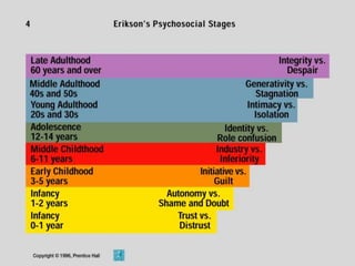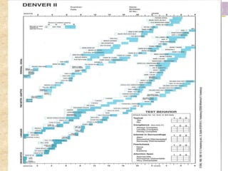 The document discusses key concepts in child development including developmental dimensions, theories, milestones, and considerations for assessment across different age groups. It covers physical, cognitive, language, and social-emotional development, referencing theorists like Piaget, Erikson, and Mahler. The goal is to understand normal development as a framework for evaluating children and to tailor assessments appropriately based on a child's age and needs.