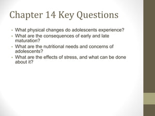 This chapter discusses the physical, cognitive, and emotional changes that occur during adolescence. It covers puberty and sexual maturation, nutrition and health issues like obesity and eating disorders, stress and coping mechanisms, risks like substance abuse, and sexually transmitted infections. The chapter examines both the challenges of this developmental period and strategies to promote well-being.