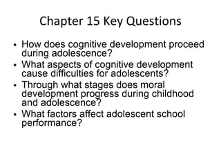 This chapter discusses cognitive development in teenagers. It covers intellectual development including formal operations and abstract thinking. It examines perspectives on information processing and metacognition. Moral development theories from Kohlberg and Gilligan are summarized. Challenges of transitioning to middle school and factors affecting school performance like socioeconomic status are addressed.
