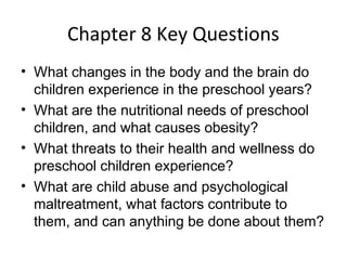 The document discusses physical development in preschool-aged children. It covers changes to the body including growth in height, weight, brain development, and motor skill development. It also addresses children's health, nutrition, illnesses, injuries, abuse, resilience, and toilet training. The document provides information on developmental milestones in these areas for preschool-aged children.