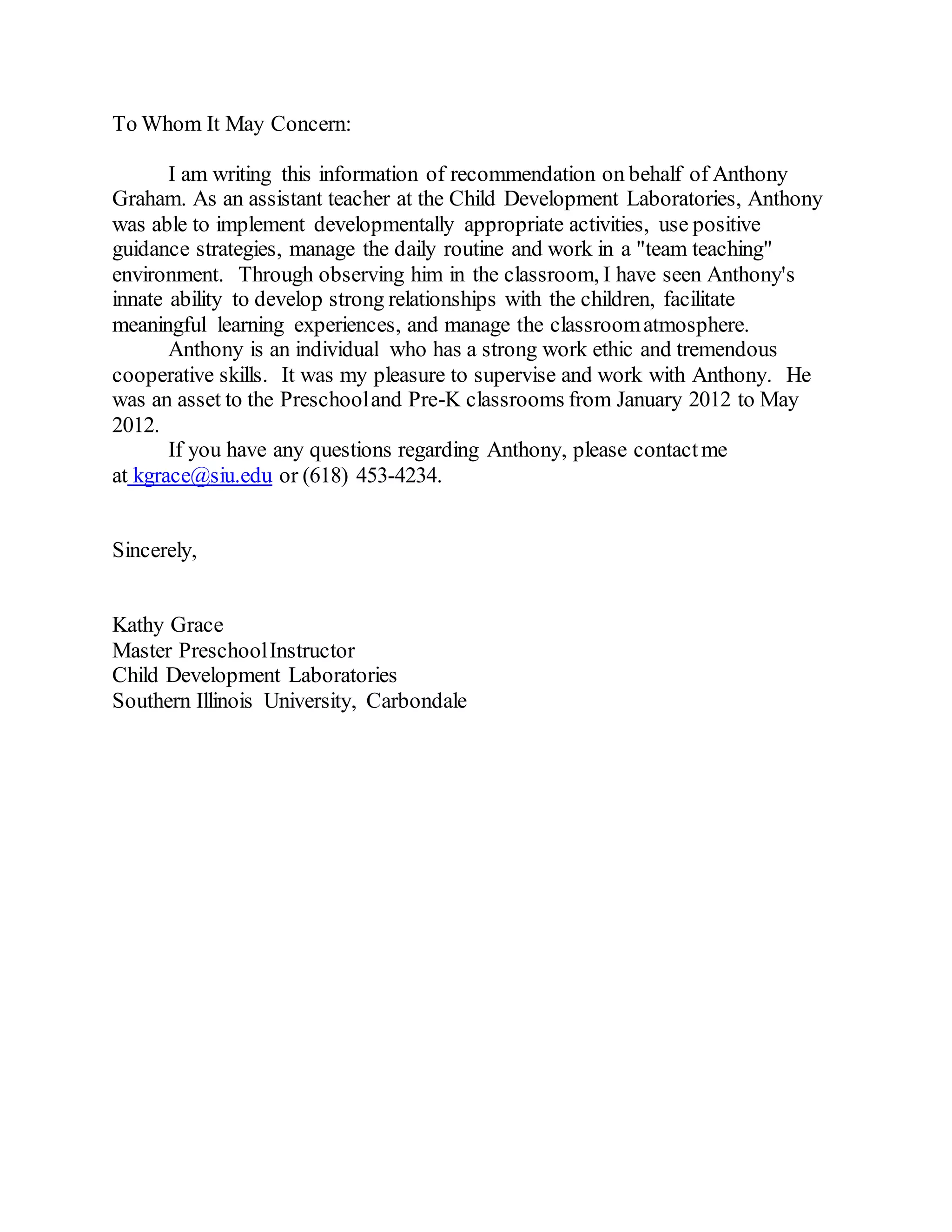 Anthony Graham worked as an assistant teacher from January 2012 to May 2012. His supervisor observed that he was able to implement developmentally appropriate activities, use positive guidance strategies, and manage the daily routine and team teaching environment. She saw that he had an innate ability to develop strong relationships with children, facilitate meaningful learning experiences, and manage the classroom atmosphere. His supervisor also noted that Anthony has a strong work ethic and tremendous cooperative skills.