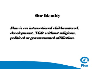 The document provides information about understanding child development and their needs. It discusses Plan International's identity as a child-centered NGO and their impact programs that focus on economic security, health, education, water and sanitation, and protection. It also outlines the methodology and duration of a training module on understanding children, their development domains of physical, cognitive, language, social and emotional. Key principles of child development are presented, including that development is holistic, multi-determined, and children are active participants. The training emphasizes understanding children in their context and building relationships through communication and comprehension.