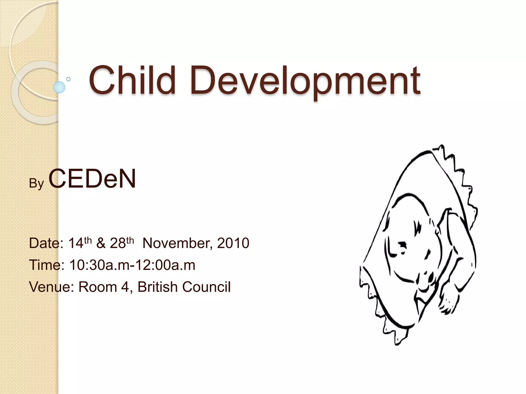 This document discusses a child development seminar that took place on November 14th and 28th. It covers several topics related to child development, including a review of key issues like nature vs nurture. Five aspects of development are outlined, including physical, motor, cognitive, social-emotional, and language. Temperament and the 9 temperament traits are defined. Birth order characteristics and strategies for parenting intense, anxious, or slow-to-adapt children are also summarized. Common childhood anxiety disorders and the impact of trauma on children are reviewed.