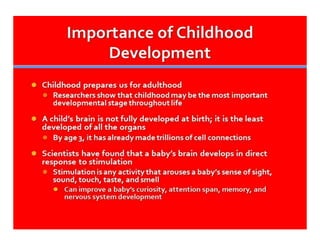 The document discusses child development across various domains from birth to adolescence, highlighting the progression from dependency to autonomy. It outlines the distinctions between growth and development, presents developmental milestones across different age groups, and reviews cognitive and social-emotional development theories, including those by Piaget and Erikson. Additionally, it emphasizes the importance of effective parenting practices and the critical early years for a child's brain development.