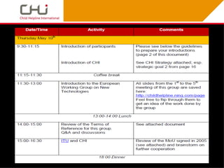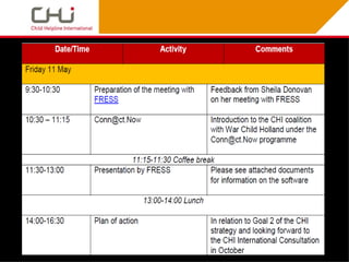 The document welcomes participants to a meeting in Amsterdam of the New Communication Technologies Advisory Council. It includes an agenda with introductory questions for participants about their work in child helplines and experience with new technologies. The agenda also covers topics like how new media can be used in service delivery and organizational development, and aligning with CHI's strategic objectives around access to child helplines. Participants are asked to envision the future of child helplines and new technologies.