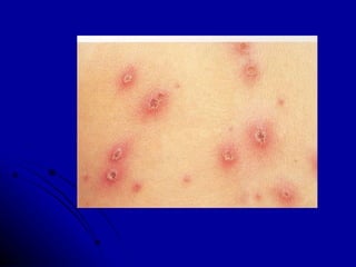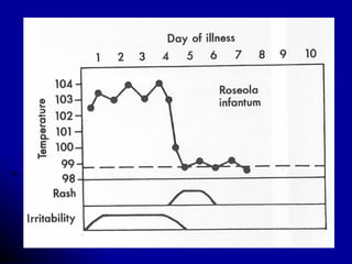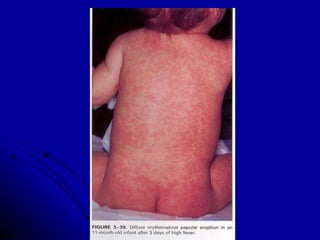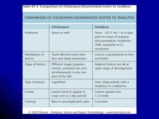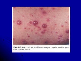 3) It briefly outlines varicella (chickenpox), caused by varicella-zoster virus, presenting with a centripetal vesicular rash that is highly contagious until lesions crust over.