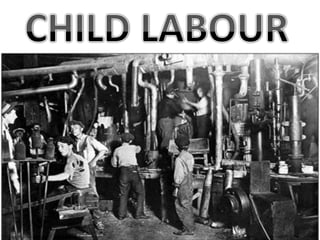 This document summarizes the working conditions of children in early factories and mines in 3 paragraphs. It describes the dangerous equipment and accidents children faced, their long hours and low pay that was often not paid, and the types of difficult jobs children had in factories and mines like coal mining and moving things inside mines. A brief comparison is made between past child labor and present times showing children now have more freedom to play instead of work.