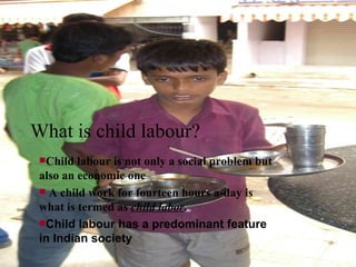 Child labour is a major social and economic problem in India, with estimates of between 20-50 million children working long hours in difficult conditions. Poverty is the main driver of child labour, as poor families rely on children's work for survival. Children often work in mills, factories, mines, shops, and other hazardous environments instead of attending school. While laws prohibit hazardous child labour, stronger enforcement of policies that address poverty and generate adult employment are still needed to effectively tackle the root causes and break the cycle of child labour across generations in India.