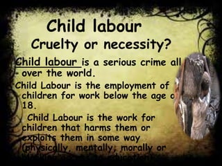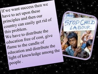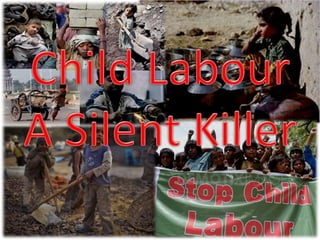 Child labour is a serious problem in Pakistan, with around 3.8 million children aged 5-14 working according to a recent survey. Common forms of child labour in Pakistan include working in agriculture, mining, manufacturing such as carpet weaving, and domestic work such as shoe shining. Child labour results in negative consequences for children's health, education, and development. While the Pakistani constitution and laws prohibit child labour, poverty and lack of access to education continue to drive the problem. NGOs and international organizations are working with the government to raise awareness, provide education opportunities, and advocate for stronger policies to eliminate child labour.