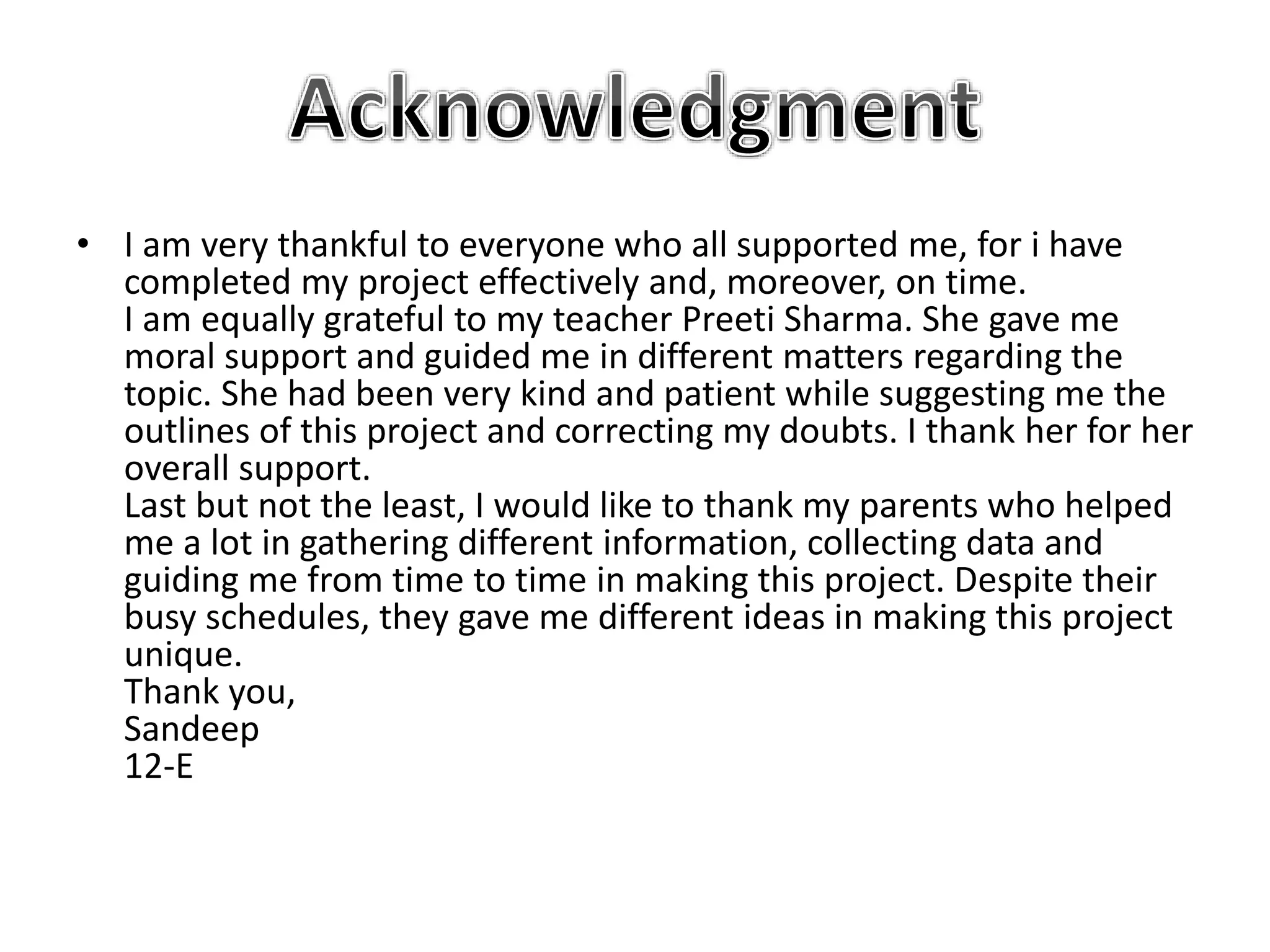 The document discusses a student thanking various people who helped with completing their school project successfully and on time. The student thanks their teacher for moral support, guidance on their topic, and for being patient and helpful. The student also thanks their parents for helping gather information, collect data, and provide ideas to make the project unique, despite their busy schedules.