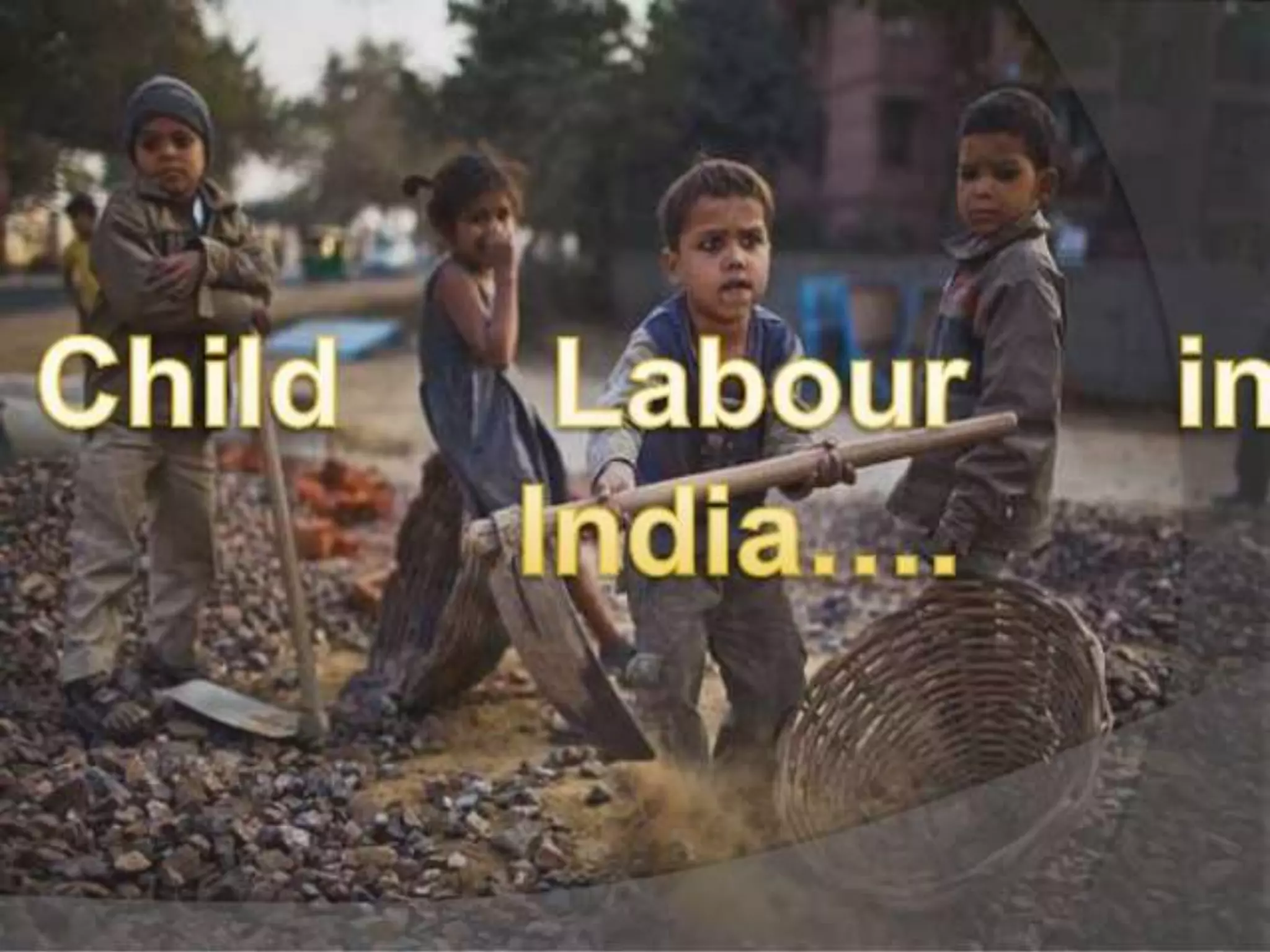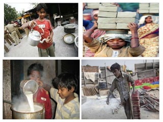 Child labour refers to children under age 14 working full or part-time. In India, there are over 10 million child laborers, many working as bonded servants. Lack of primary schools, poverty, parental illiteracy, unemployment, and overpopulation are leading causes. Children face physical and health risks from abusive labour. Solutions include increasing income and education, social services, and awareness campaigns.
