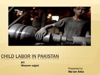 Child labor is a significant problem in Pakistan, with an estimated 19 million children aged 5-15 currently working. It takes many forms, including in agriculture, auto workshops, mining, and street work. Poverty is a major driver of child labor in Pakistan, along with issues like excess population, illiteracy, and unemployment. The government has passed some laws aimed at restricting child labor, but enforcement remains a challenge, and child labor continues to deprive many Pakistani children of their education and development.
