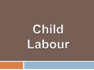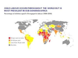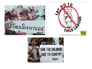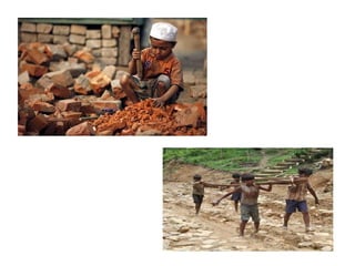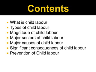 The document discusses child labor, defining it as the employment of children in exploitative conditions, and classifies it into various types, including migrant and bonded labor. It highlights the global magnitude of the issue, noting significant statistics from developing countries, especially India, where millions of children are engaged in various sectors under harsh conditions. The document also addresses the causes of child labor and suggests prevention measures, emphasizing the importance of education and awareness in eradicating this problem.