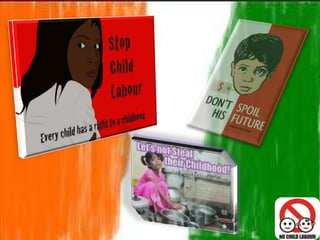 The document discusses the history of child labor, present situations, and causes. During the Industrial Revolution, many young children worked in dangerous factory conditions, with over 2 million children employed in the US by 1900. Currently, most child labor occurs informally, such as selling goods in streets or working in agriculture. In India, estimates of child laborers range from 20-50 million, with poverty, lack of education, and cheap labor exploitation as driving factors. The future of communities relies on protecting children through education rather than exploitation.
