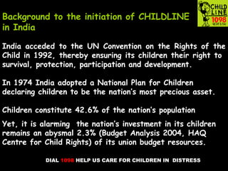 The document discusses the background and rationale for CHILDLINE India, which is a 24-hour phone service for children in need of care and protection. It was established in 1996 in response to the large number of children without access to services. The toll-free number 1098 connects callers to local call centers that dispatch emergency responders within 60 minutes. CHILDLINE now has over 150 call centers across India and responds to millions of calls annually, providing services to vulnerable children. The organization aims to establish a child-friendly nation by protecting children's rights through advocacy, awareness, and integrated efforts across government and nonprofit groups.