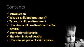 The document discusses child maltreatment as a global problem with serious negative impacts on physical and mental health. It notes that while millions of children experience abuse annually, recognition of the issue has increased in recent decades. The document reviews prevalence data showing high rates of physical and sexual abuse globally. It is noted that child maltreatment can contribute to long-term health issues and hamper a country's development. The types and risk factors of child maltreatment are defined. Studies of prevalence in Saudi Arabia are presented, showing physical abuse and neglect are most common but underreporting is an issue. The document calls for improved awareness, data collection, and prevention programs to address child maltreatment.