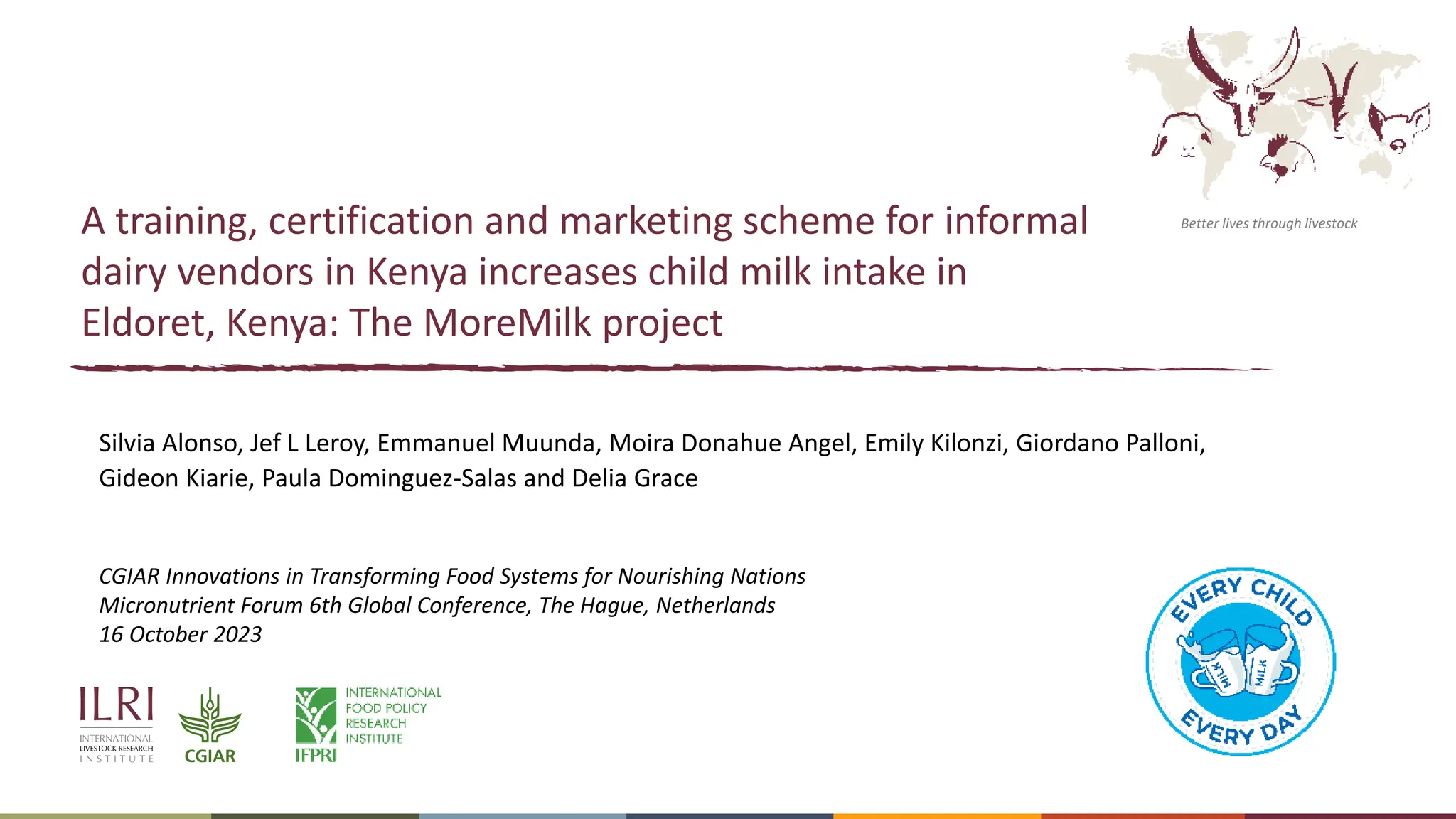 The document discusses the 'MoreMilk' project, which aimed to improve child milk intake among informal dairy vendors in Eldoret, Kenya, through training and a marketing campaign. Results indicated a significant increase in daily milk consumption without compromising diet adequacy for micronutrients. However, issues such as microbiological quality and the sustainability of improvements raised concerns about broader food safety and long-term practices.