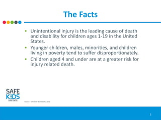 Child Passenger Safety is important for protecting children in vehicles. Statistics show that unintentional injury is a leading cause of death for children ages 1-19 in the US. In 2014, over 602 children ages 12 and younger died in motor vehicle crashes, and many were not properly restrained. South Carolina data from 2013 found that 49% of child passengers were not properly restrained. It is recommended that children rear-face until age 1 and weighing 20 pounds, forward face from 1-5 years old and 20-40 pounds, and use a booster seat from ages 1-5 and 40-80 pounds. Common mistakes in child passenger safety include using an improperly installed or uninspected seat. Heatstroke from being