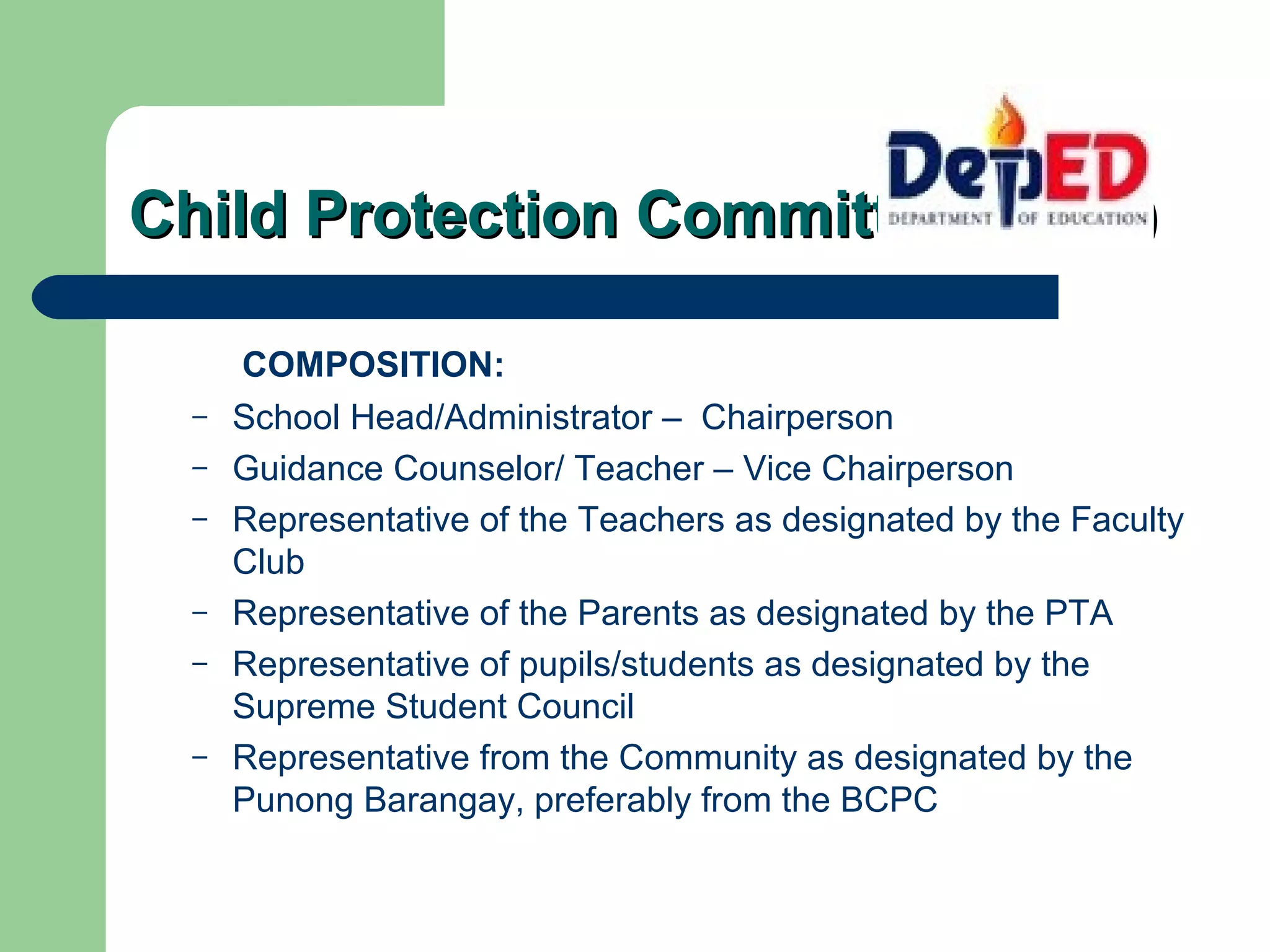 The document outlines the composition and responsibilities of Child Protection Committees (CPC) in schools. CPCs are chaired by the School Head and include representatives from teachers, parents, students, and the community. Their responsibilities include assessing cases of abuse using an Intake Sheet and reporting actions taken. The document also defines prohibited acts against children like abuse, discrimination, exploitation, violence, bullying and corporal punishment. It provides the legal basis and establishes procedures for DepEd to handle cases of child protection in a positive and non-violent manner.