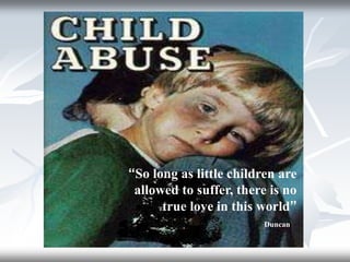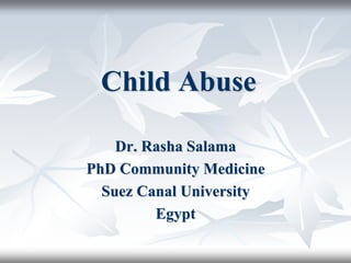 This document discusses child abuse in Egypt. It provides definitions of child abuse, outlines children's rights according to the National Council for Childhood and Motherhood in Egypt, and describes the main types of child abuse - physical, sexual, emotional, and neglect. It examines risk factors for child abuse and the health consequences. It discusses the role of family physicians in identifying and responding to suspected child abuse cases. Finally, it outlines some national initiatives and programs in Egypt aimed at eliminating child abuse practices like female genital mutilation, protecting street children, and strengthening the juvenile justice system.