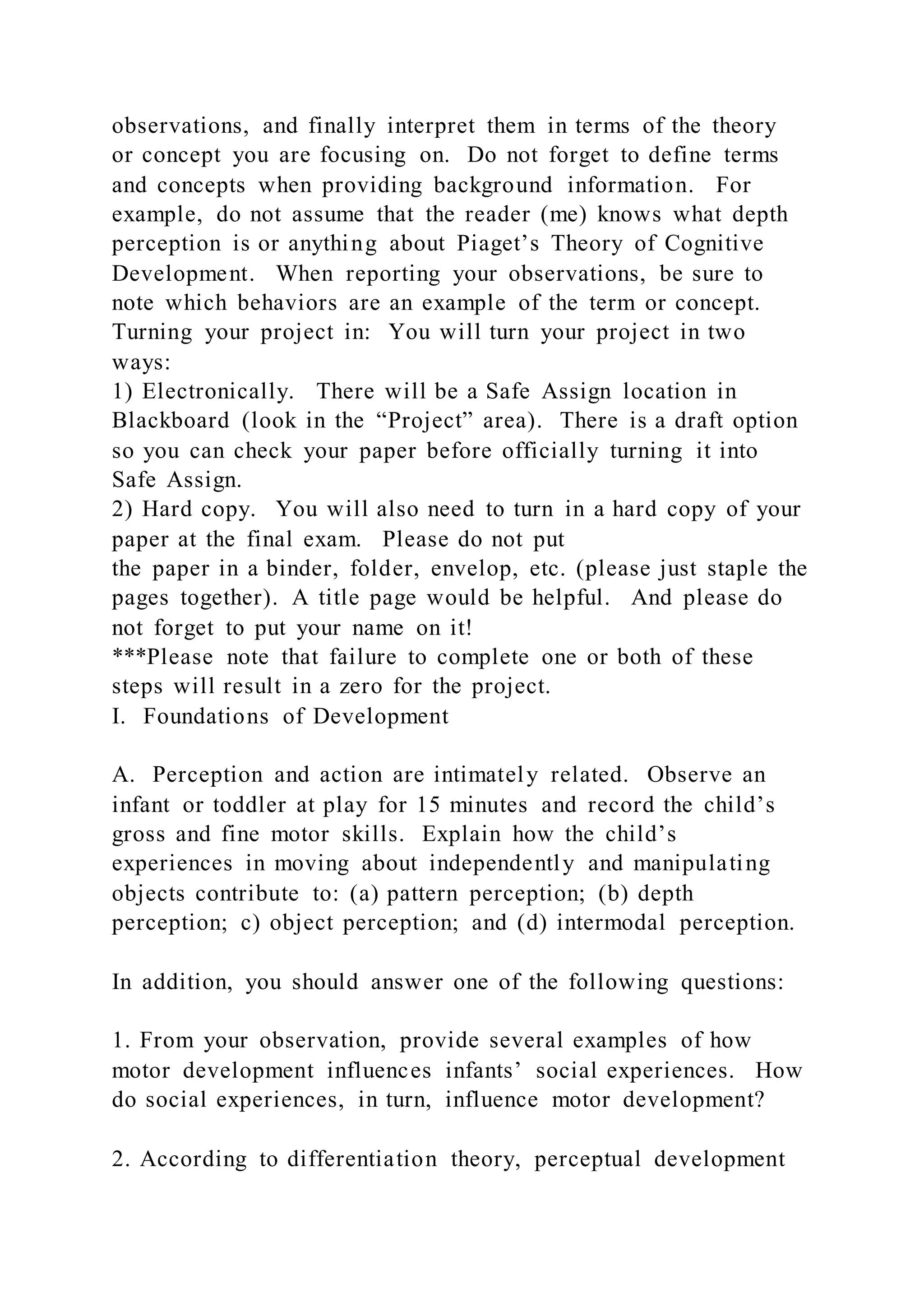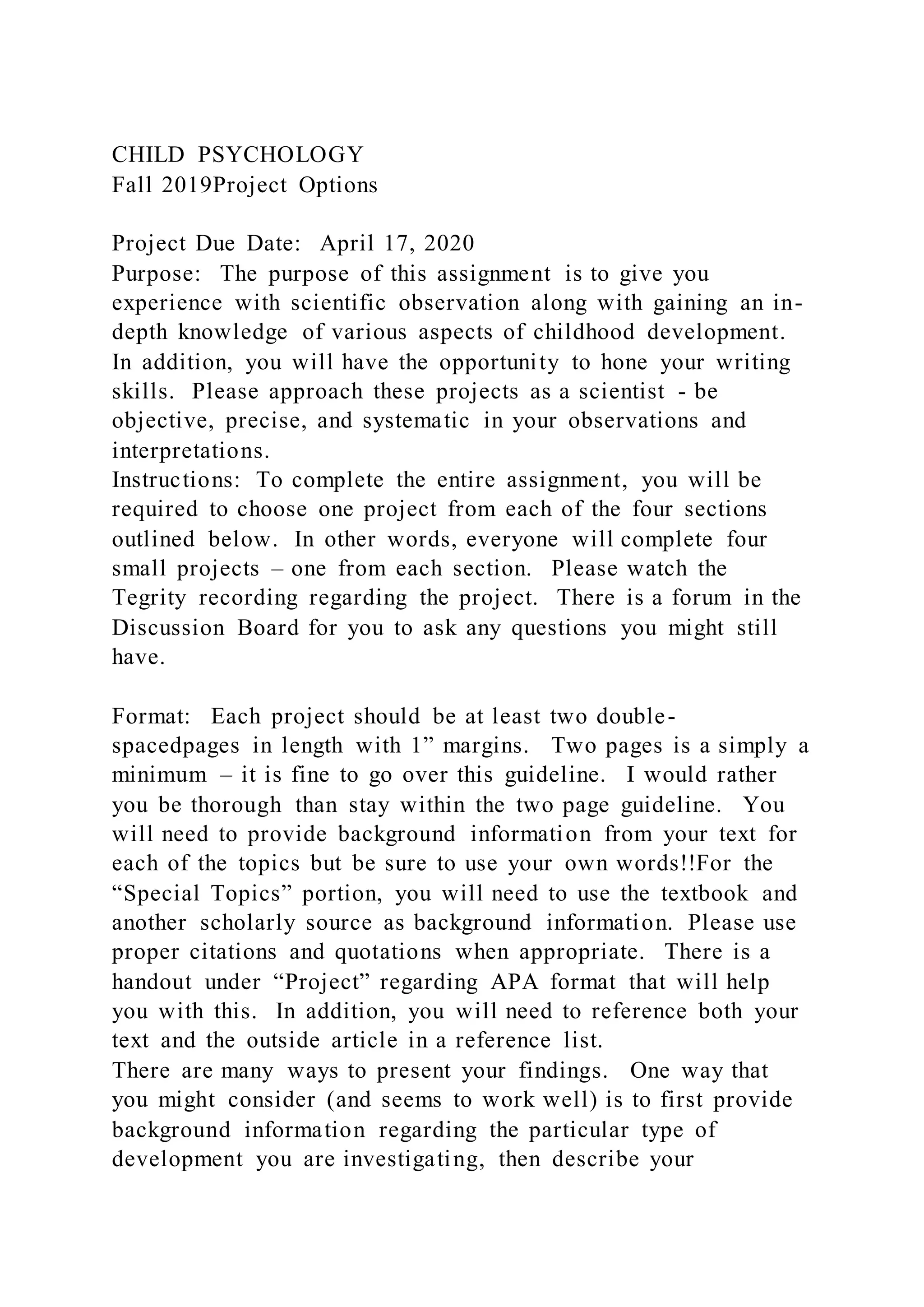 The document outlines a project for a Child Psychology course that involves systematic scientific observation and analysis of various aspects of childhood development, due on April 17, 2020. Students must choose and complete four small projects from specified sections, focusing on topics like motor skills, cognitive development, social interactions, and special topics, ensuring adherence to APA guidelines and submission requirements. Observations and findings must be documented thoroughly, supported by theoretical background, and presented in their own words.