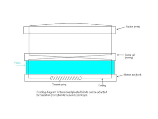 This document provides tips for making a home safer for children who are blind. It recommends using cord cleats and P clips to tidy up dangling cords from blinds and shades. It also suggests using breakaway connectors on blinds and shades and opting for wand-operated or gear-operated blinds to avoid exposed cords that could pose a risk. Pleated tensioned blinds and Venetian blinds with breakaway tassels are also safer options.
